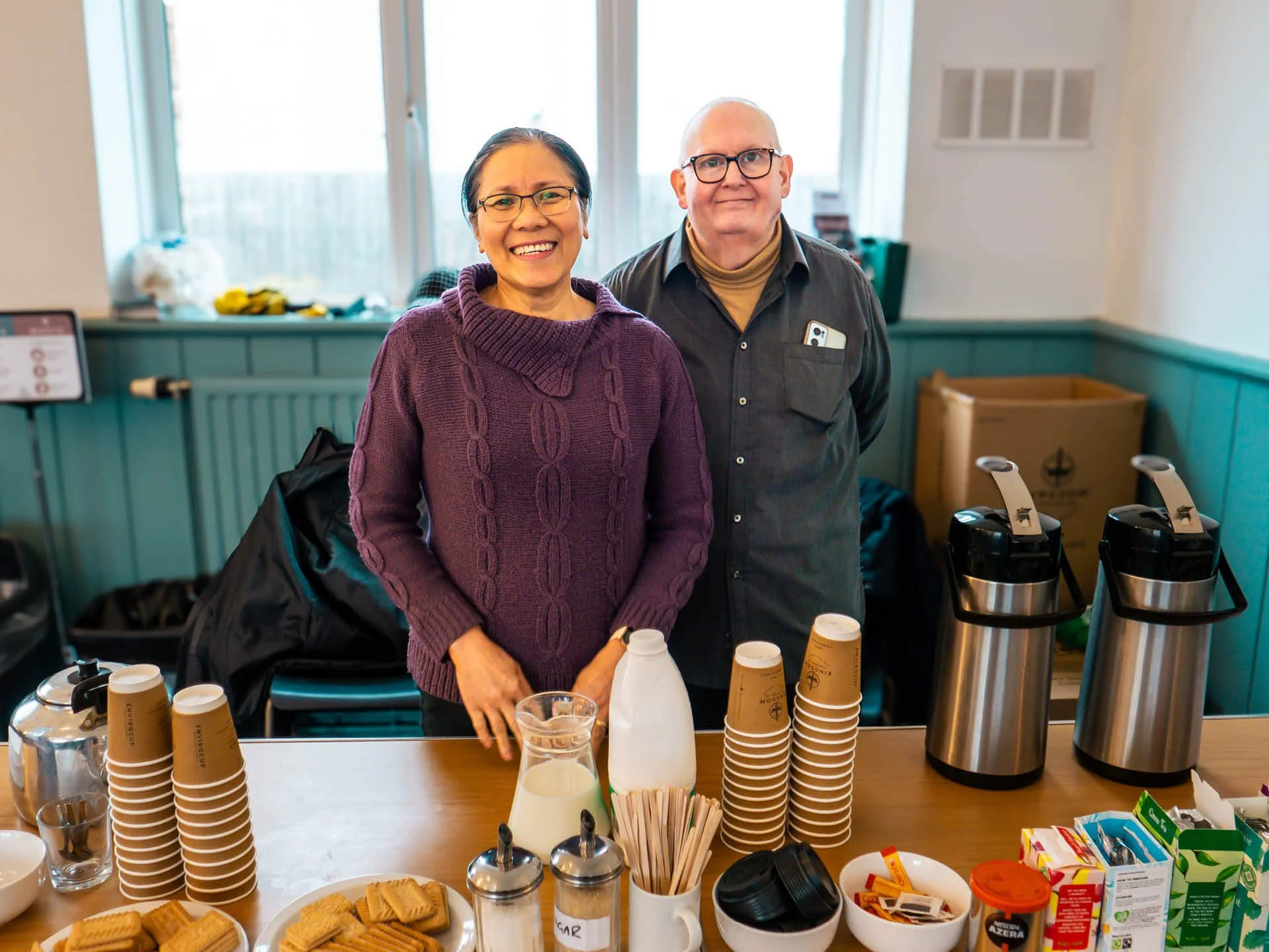 Serving tea, coffees and biscuits before and after a Sunday meeting.